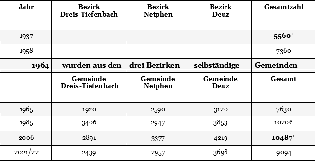 Nun hat sich aber seit 2006 der Trend umgekehrt und es ist ein stetiger Rückgang an Gemeindegliedern zu verzeichnen. Eine der sichtbarsten Folgen dieser Veränderungen ist, dass die Presbyterien der Gemeinden Dreis-Tiefenbach, Netphen und Deuz beschlossen haben, sich zum 01. Januar 2021 zu einer Gemeinde mit dem Namen "Evangelisch Reformierte Kirchengemeinde Dreieinigkeit" zusammenzuschließen.